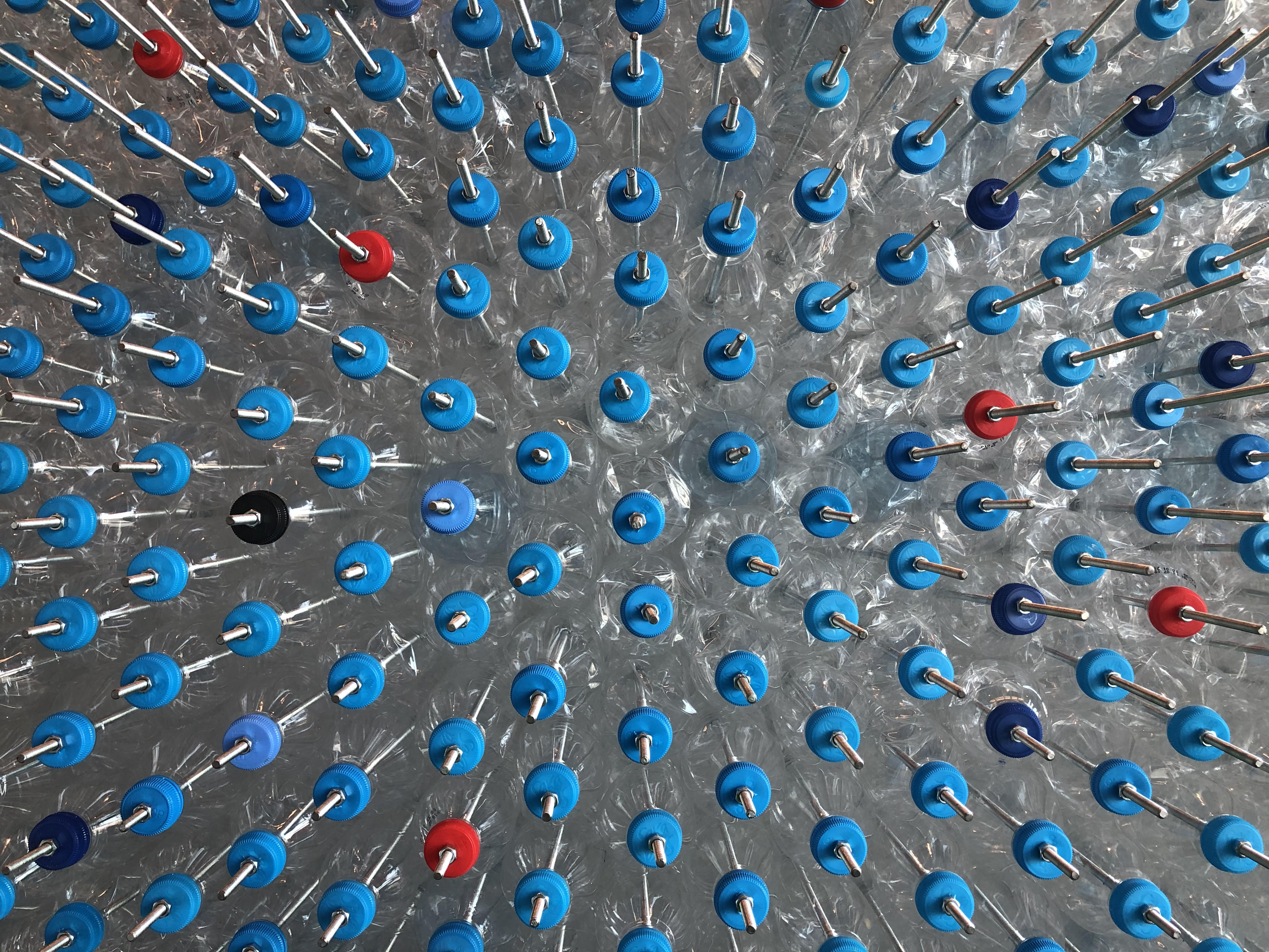 Plastik şişeler 1000 mm’ye 1425 mm’lik dört adet akrilik panel üzerine 1260 adet çelik tij ile yerleştirilmiştir. Her panel 17 veya 18 dikey dizilimden oluşmakta ve toplam 1260 şişe ile birlikte her panelde 324 veya 306 eleman bulunmaktadır. Panellerdeki şişe yükseklikleri 50 ila 205 milimetre arasında değişmektedir. Her bir şişenin yükseklik değeri panellerin alt kısmına kazınmış olup, şişeler altıgen olarak düzenlenmiştir. Şişeleri çelik tijler üzerine yerleştirmek için her şişe ve kapakları delinmiştir. Plastik şişeler çelik tijler üzerinde somunlar yardımı ile sıkılarak belirlenen yüksekliklere ulaşılmıştır. Her şişenin belirli yüksekliklerde yerleşmesi, 4 metre genişliğinde dalgalı bir yüzey oluşturmuştur. LIQUID'de çok sayıda parametre ve veri hassas bir şekilde kontrol edilmişken tek bir girdi, kapakların rengi, toplanacak şişelerin markaları tahmin edilemediğinden ve şişe kapaklarının renkleri markalara göre büyük ölçüde değişkenlik gösterdiğinden öngörülemez olarak kalmıştır.