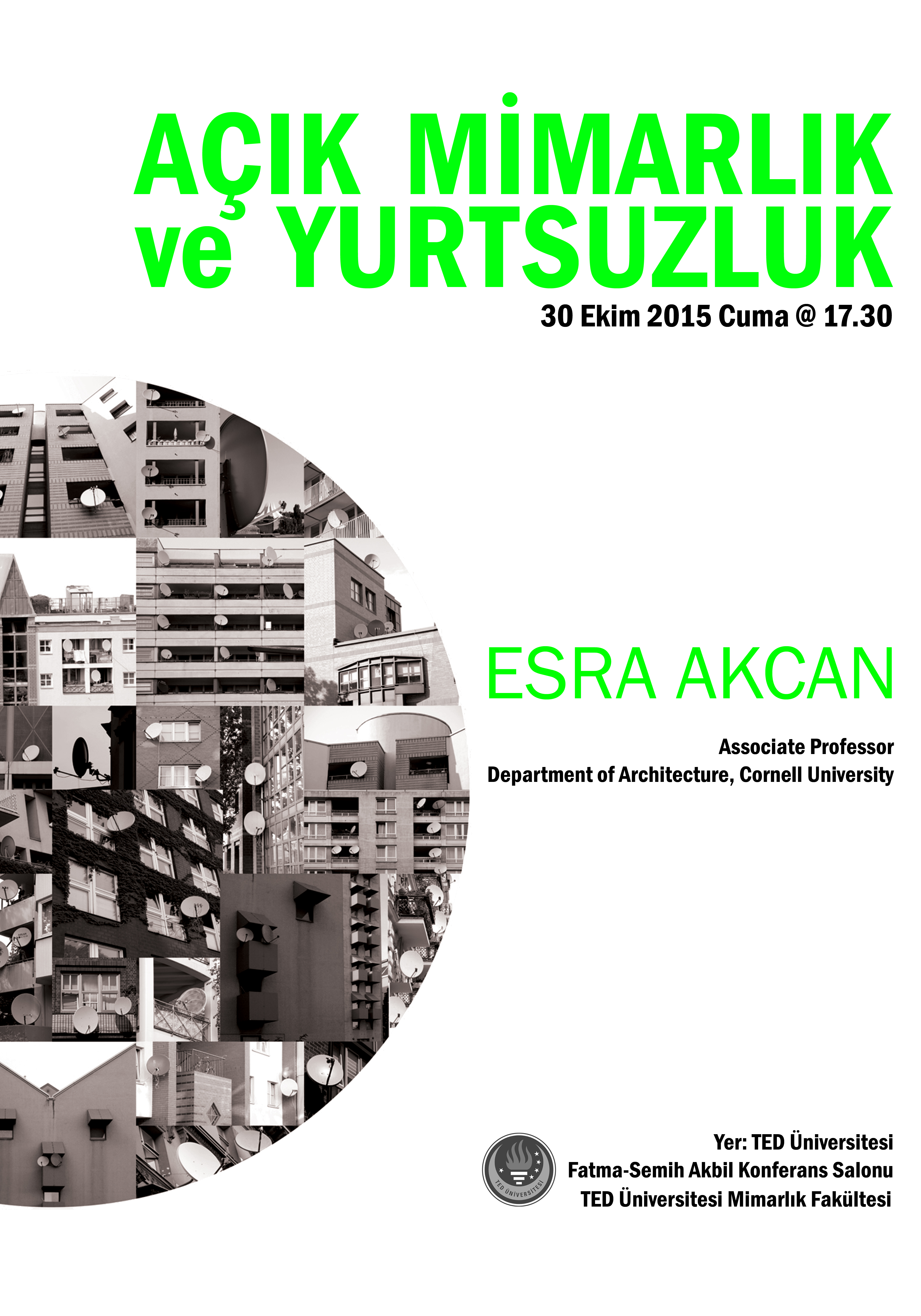 TED Üniversitesi Mimarlık Fakültesi tarafından düzenlenen ve Cornell Üniversitesi öğretim üyesi ESRA AKCAN tarafından yapılacak olan “AÇIK MİMARLIK VE YURTSUZLUK” başlıklı sunuş, 30 Ekim 2015 Cuma günü saat 17.30’da TEDÜ Fatma-Semih Akbil Konferans Salonunda gerçekleşecektir.